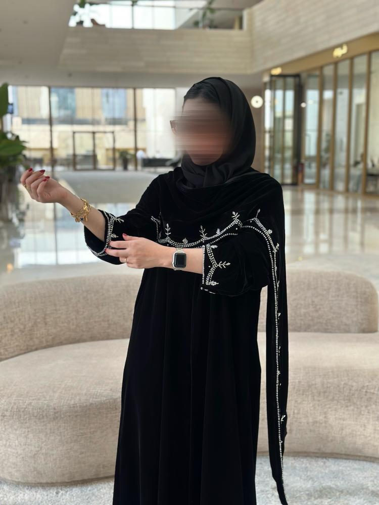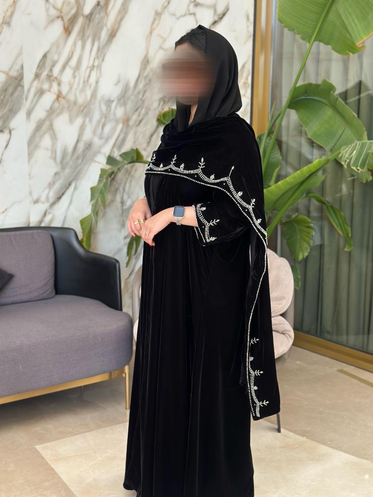 تميّزي بإطلالة فريدة مع هذه العباية المصمّمة من أفخم أنواع قماش المخمل الملكي، المعروف بملمسه الناعم ولمعانه الراقي.