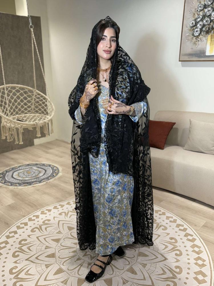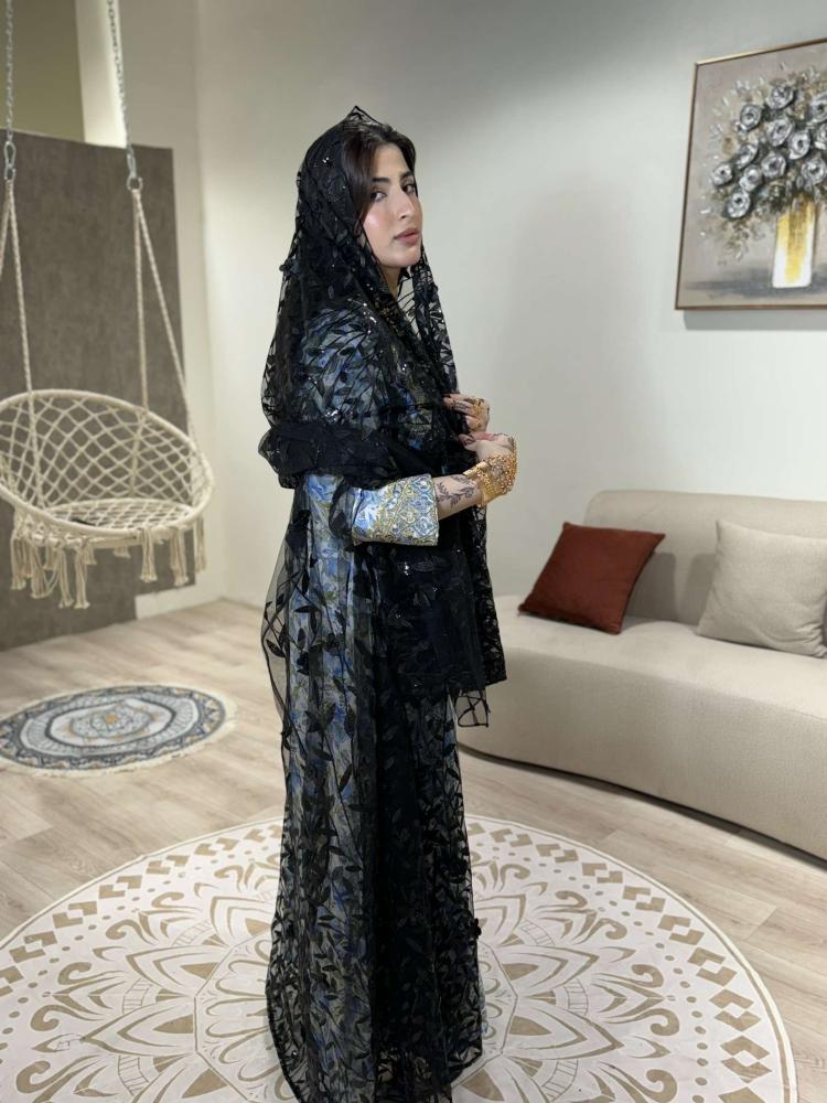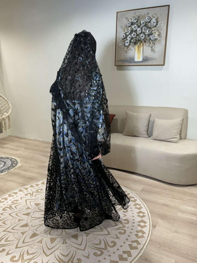 عباية "خلود" تمزج بين الأصالة والفخامة في آنٍ واحد. تأتي بتصميم شفاف أنيق من الدانتيل الأسود الراقي، ينسدل فوق طقم تراثي فاخر ليُبرز جمال التفاصيل بلغة فنية تحاكي الذوق الشرقي الراقي.