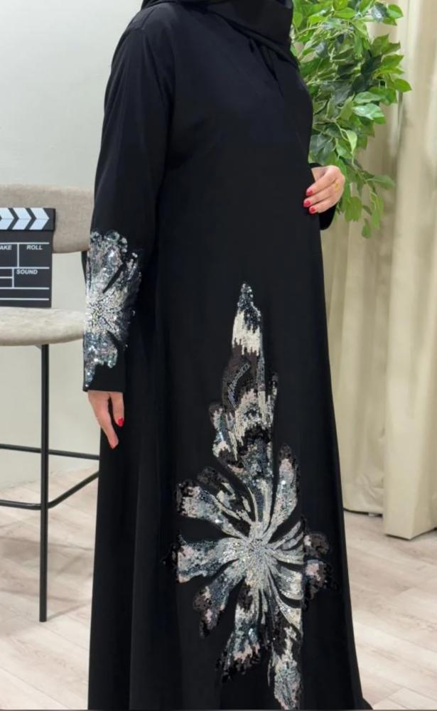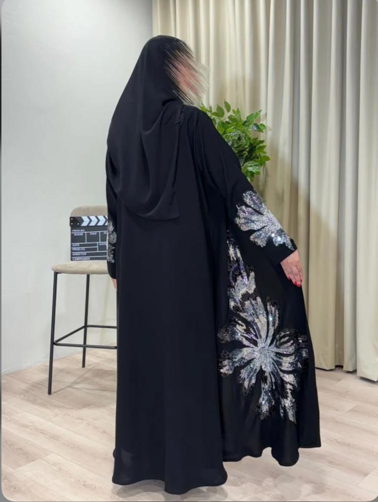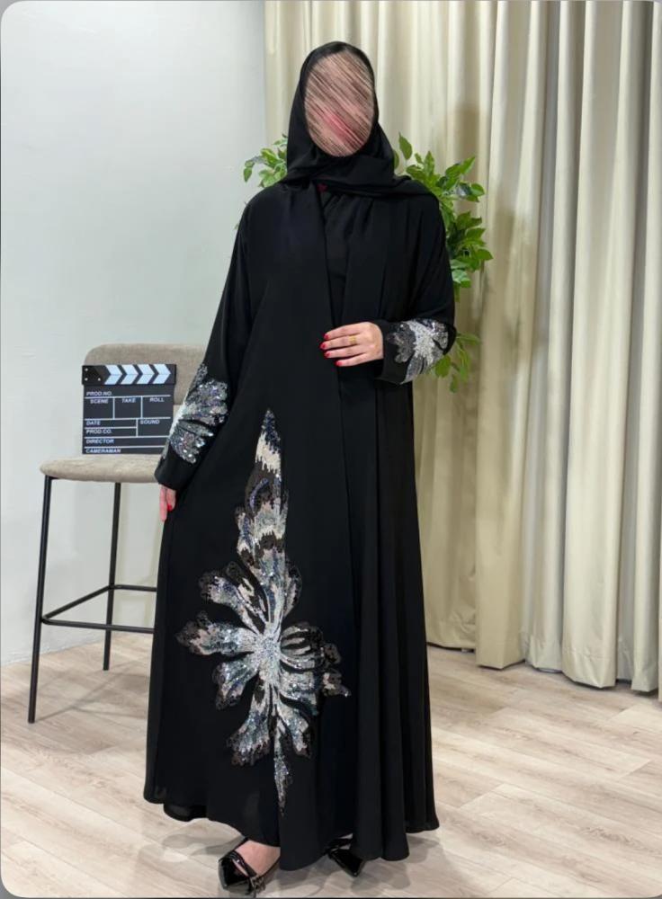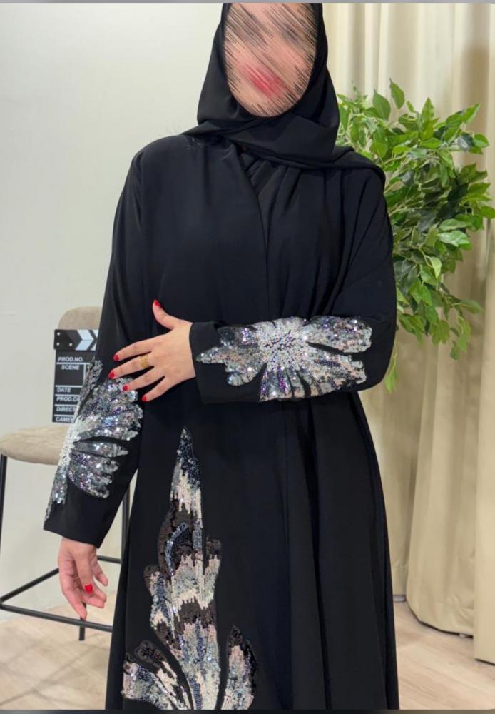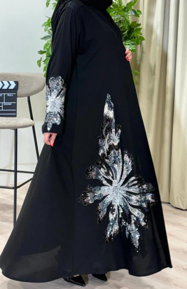 تألقي بإطلالة راقية تخطف الأنظار مع هذه العباية السوداء الفاخرة، المصممة بتطريز فاخر على الأكمام وأسفل العباية برسومات زهرية كبيرة تلمع ببريقٍ ساحر من الخيوط الفضية والرمادية. مثالية للمرأة التي تبحث عن التميز في المناسبات الخاصة والسهرات.