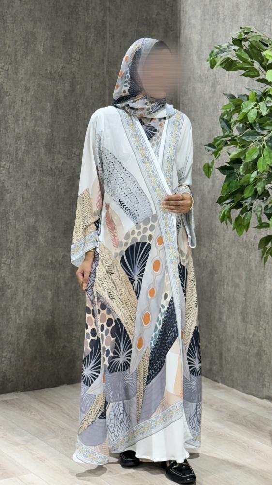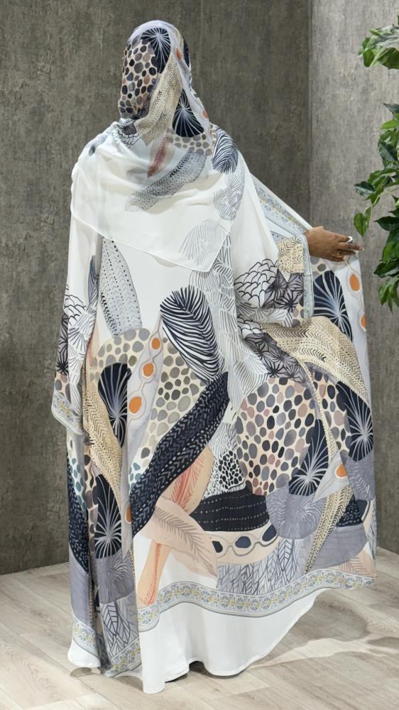 اختاري الأناقة والراحة مع هذه العباية المصممة بألوان هادئة من الأبيض والكريمي، مزينة بطبعات فنية تجمع بين النقاط، الأشكال الهندسية، والأوراق بتدرجات رائعة من الأسود، البرتقالي، والرمادي.
