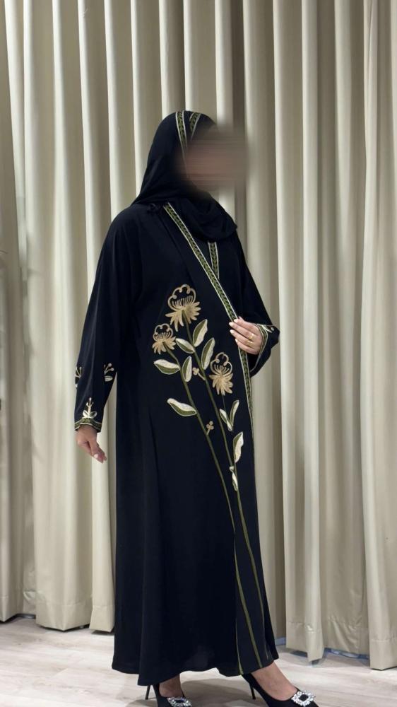 . نوع القماش :كريب الرياض مع تطريز ورد علي جانب العباية والاكمام