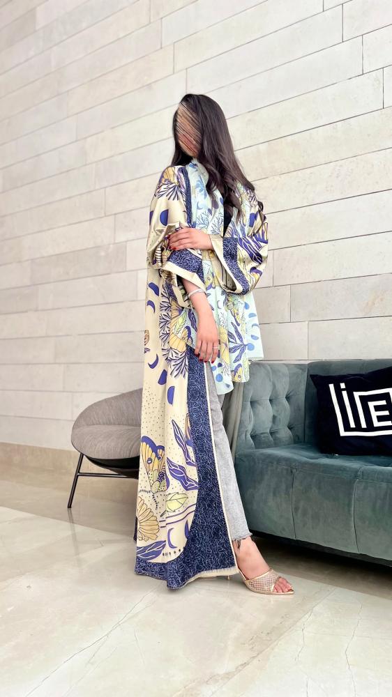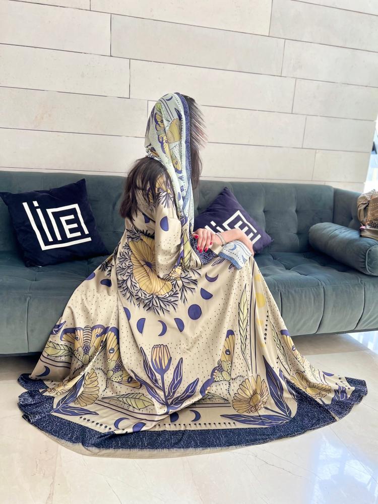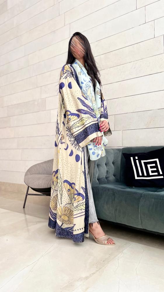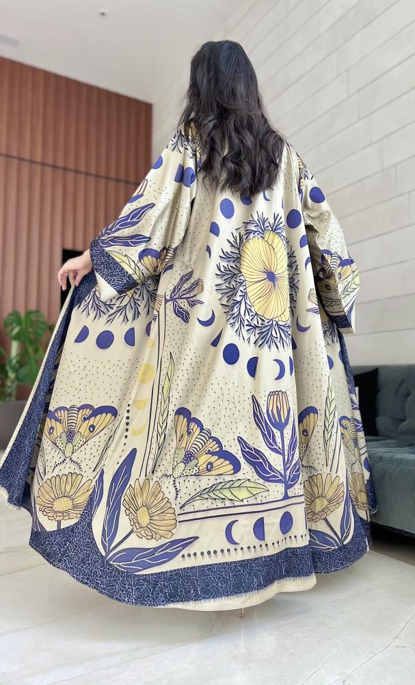 💛 الألوان: مزيج متناغم من البيج، الأزرق، والأصفر الذهبي يمنح العباية طابعًا مشرقًا وحيويًا.