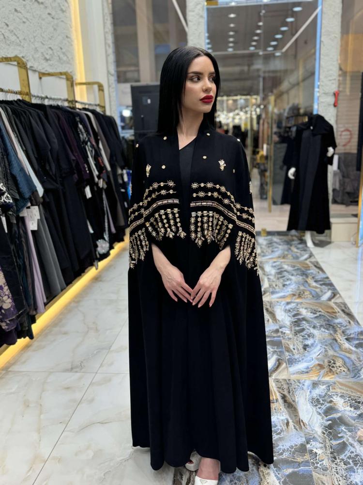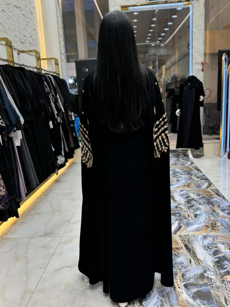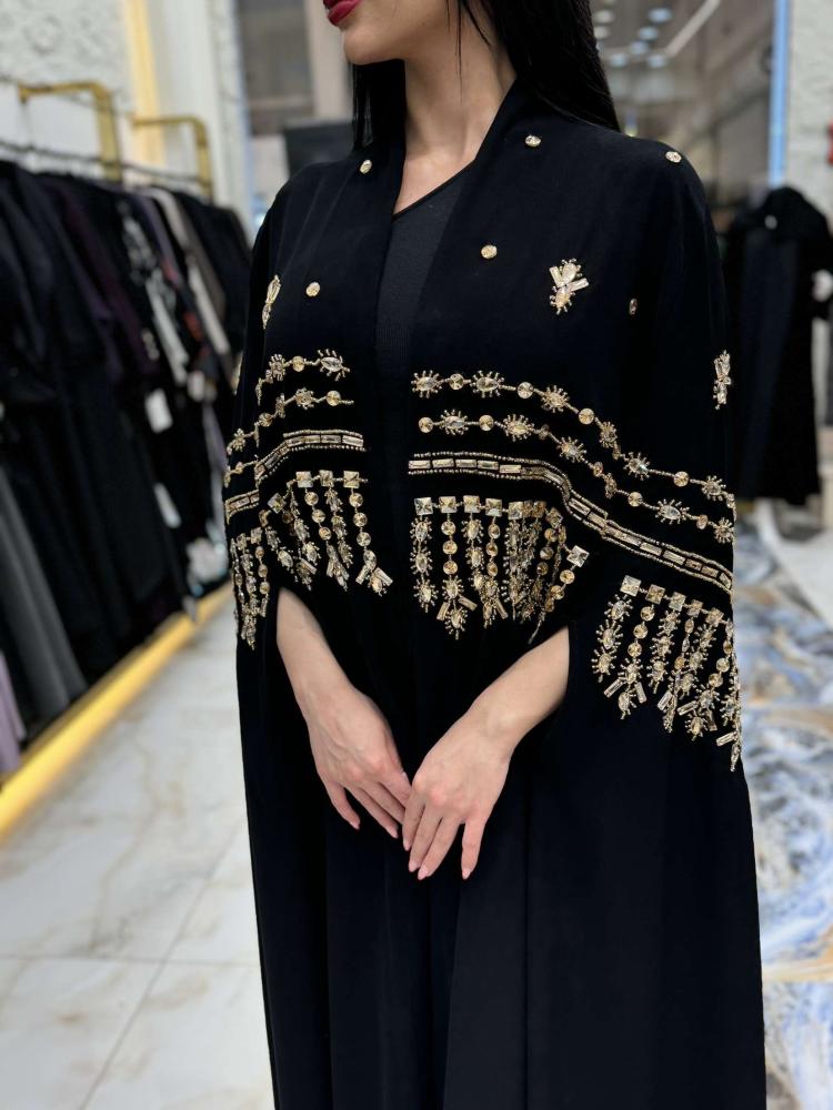 تألقي بإطلالة ملكية مع عباية لمياء، المصممة بعناية لتجمع بين الرقي والفخامة. تأتي العباية بلون أسود أنيق يعكس الفخامة، مزينة بتطريزات ذهبية فاخرة مستوحاة من الفن العربي الأصيل، تضفي لمسة من السحر والتفرد.