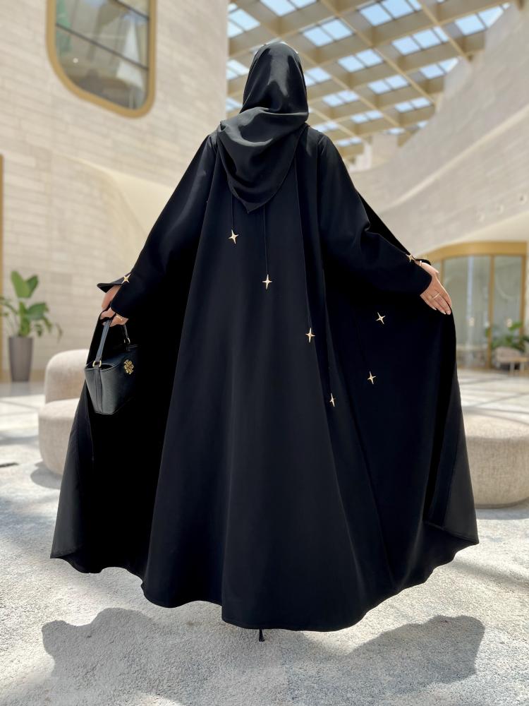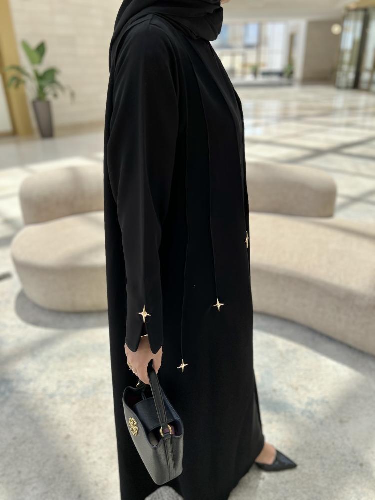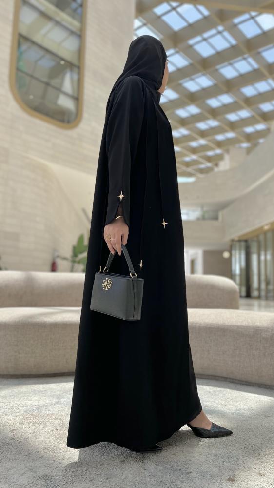 استمتعي بإطلالة ساحرة وراقية مع هذه العباية السوداء المميزة، بتطريزات ناعمة على شكل نجوم متفرقة تمنحك تألقاً يشبه سماء الليل الهادئة.