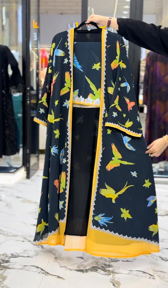 🦜 عباية مطبعة بالطيور الملونة – لمسة من الحرية والحيوية في إطلالتك