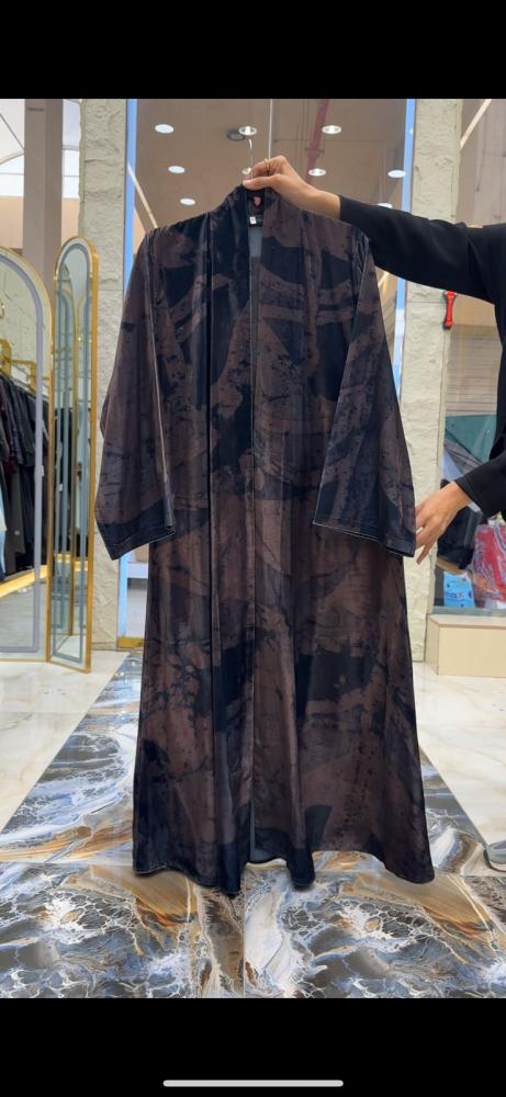 استمتعي بإطلالة استثنائية مع هذه العباية المصنوعة من قماش المخمل المُعالج بطبعات فنية، تصميمها الفريد يجمع بين الأسود العميق والدرجات البنية المتداخلة بأسلوب جذاب مستوحى من الفن التجريدي العصري.